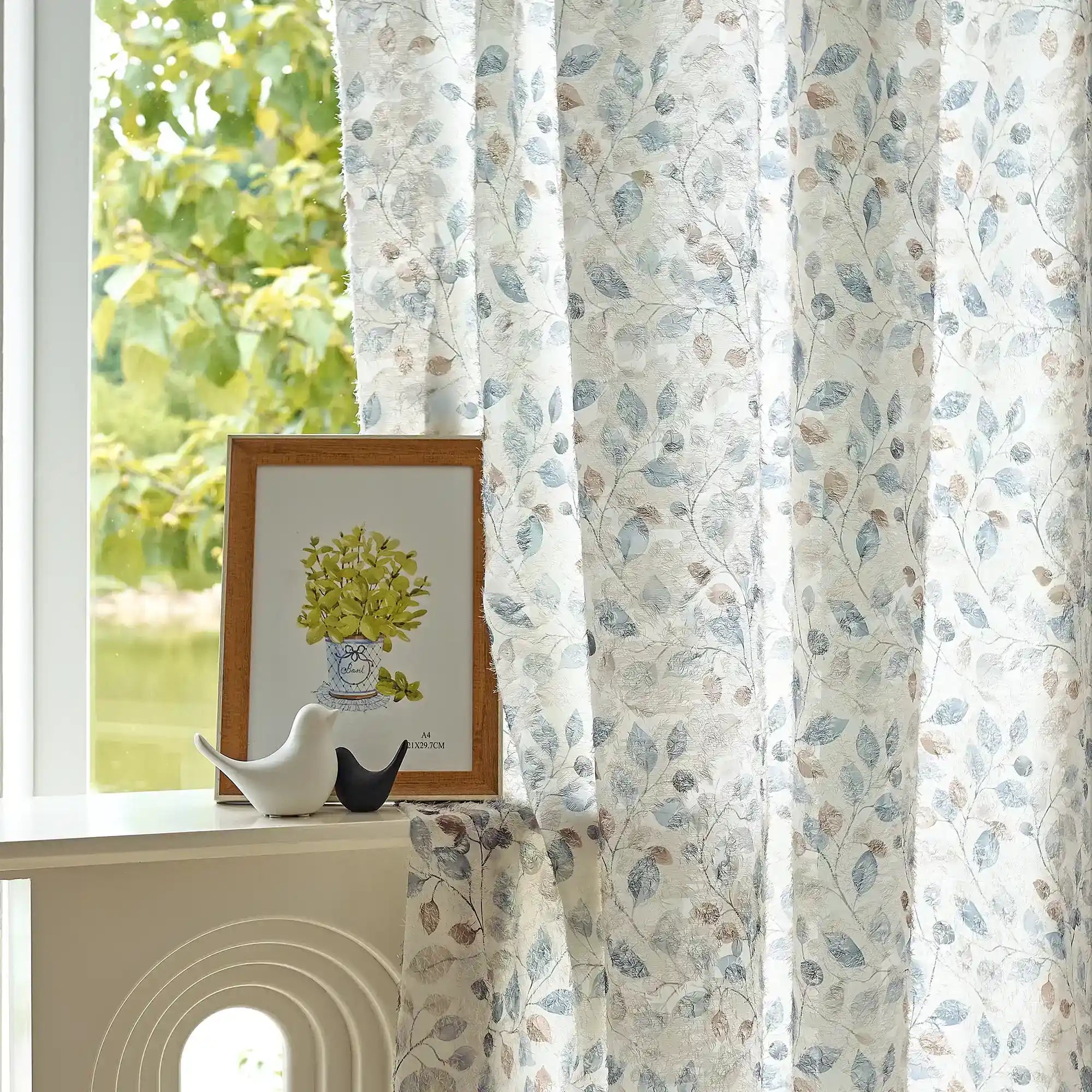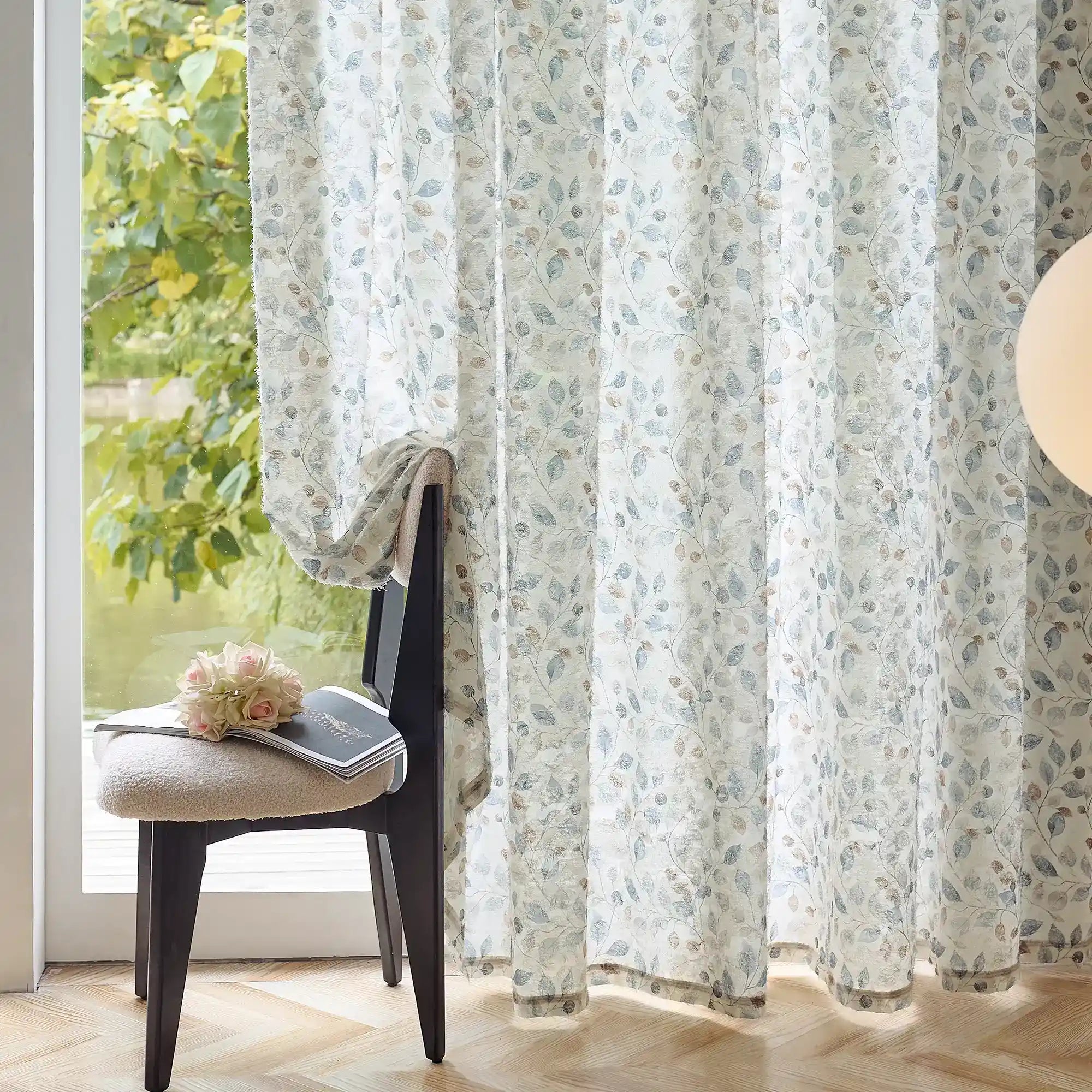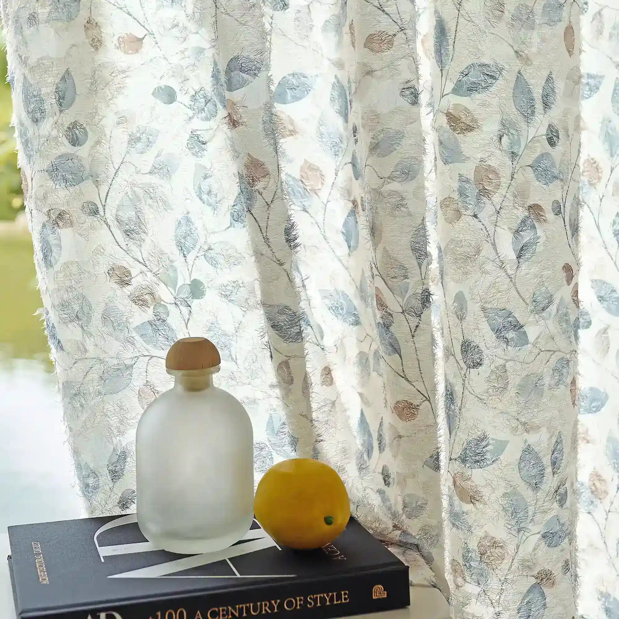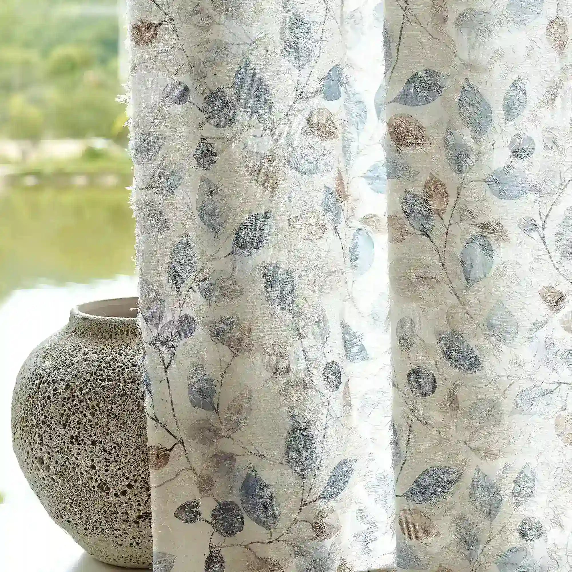 Ilyana Blue & Beige Leaf Patterned Print Sheer Curtains