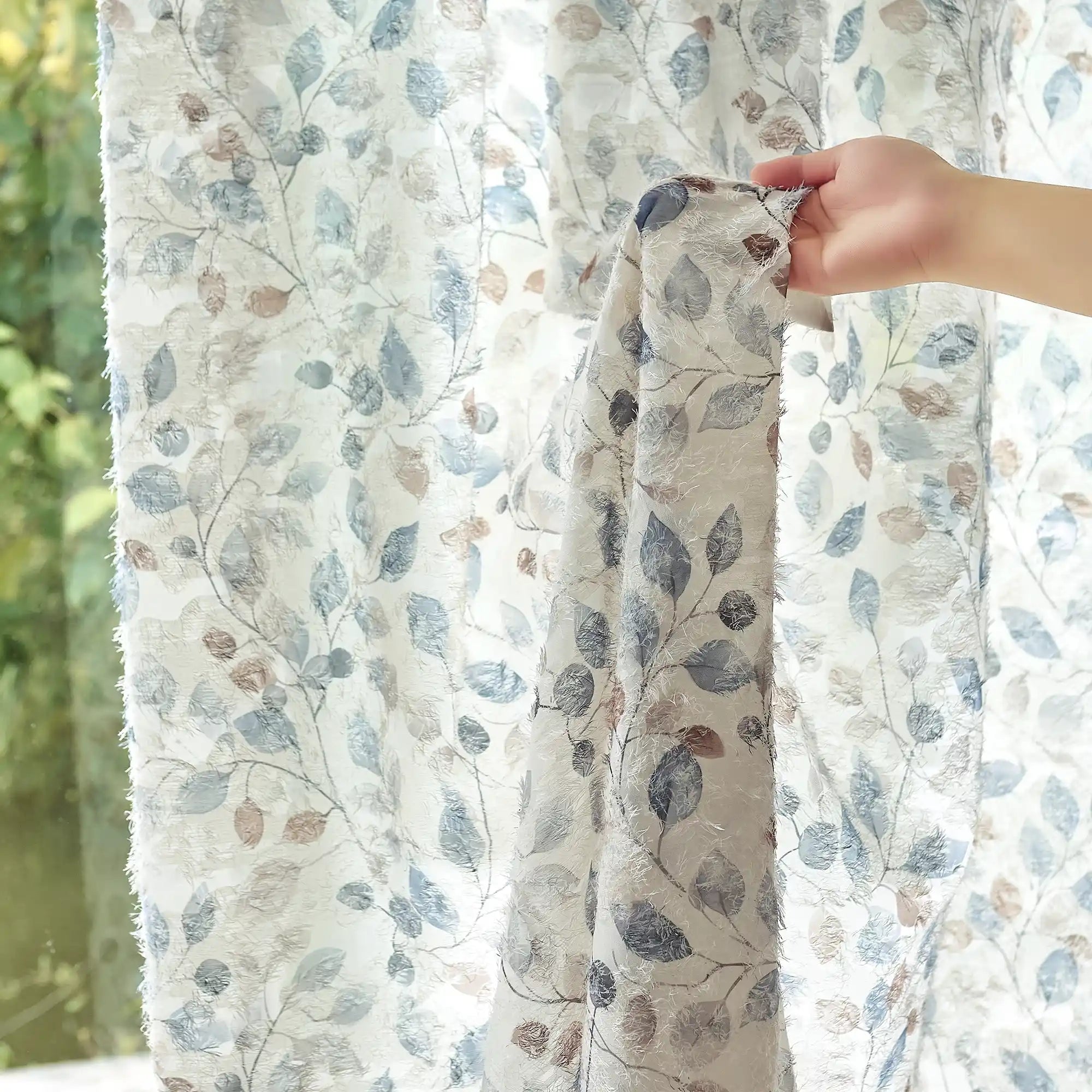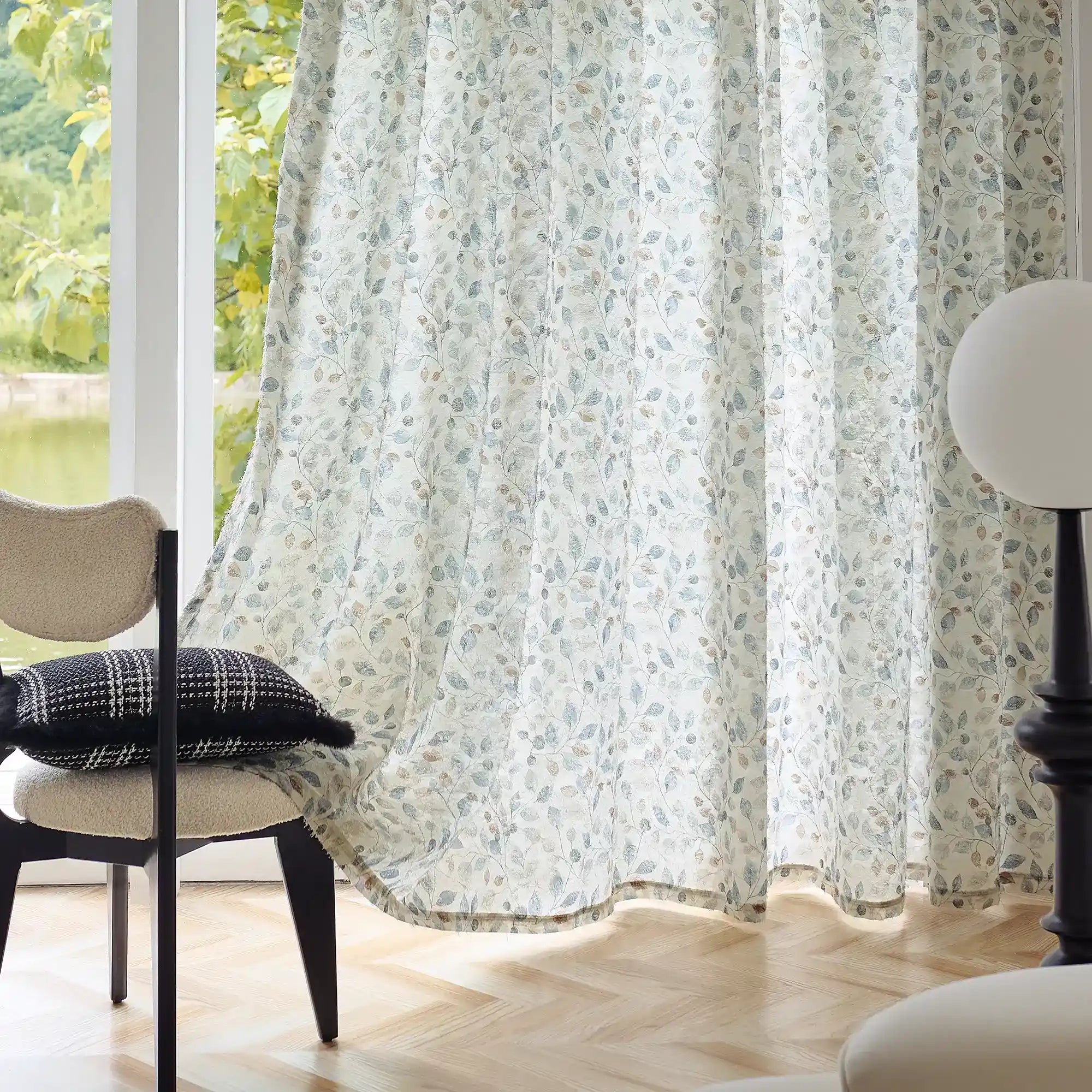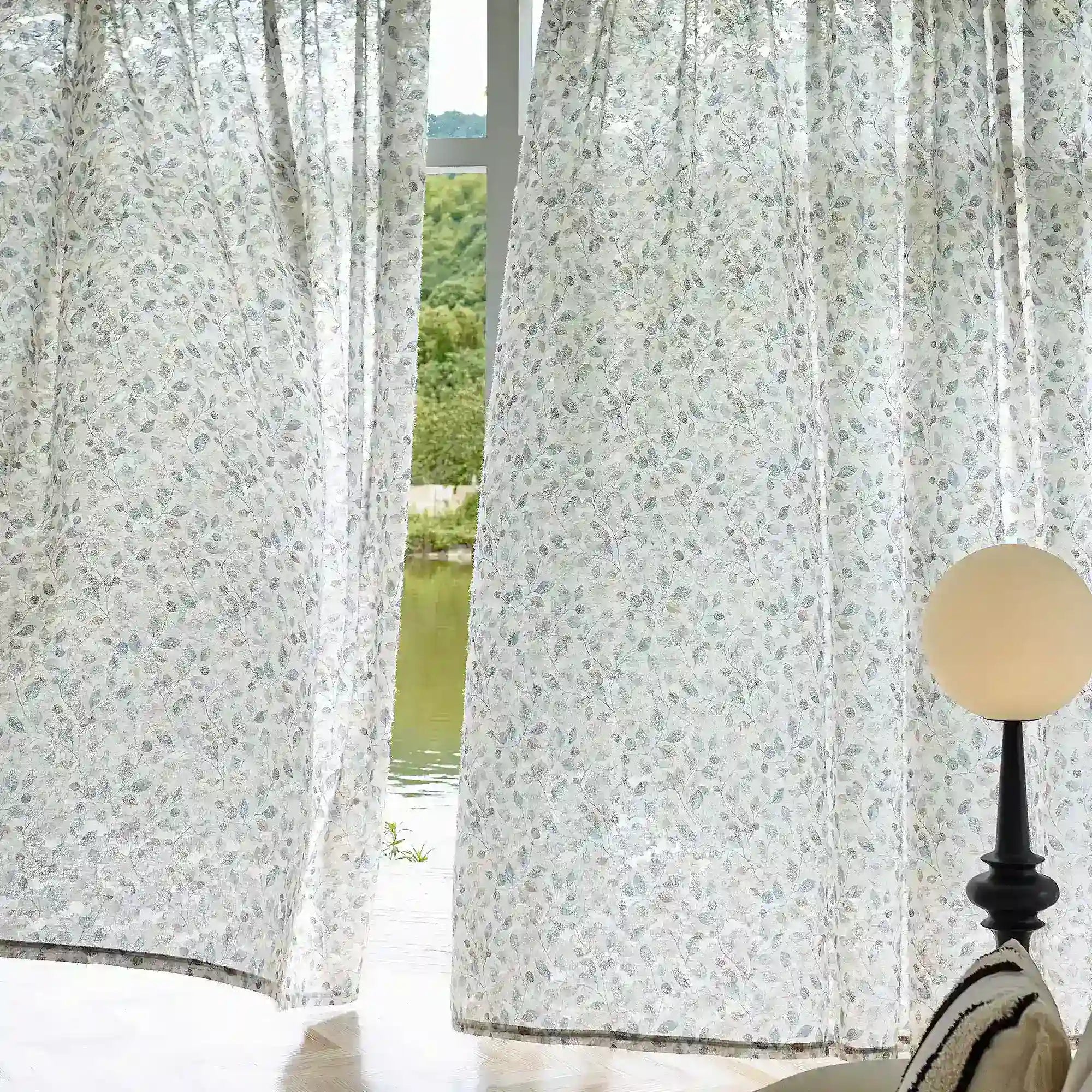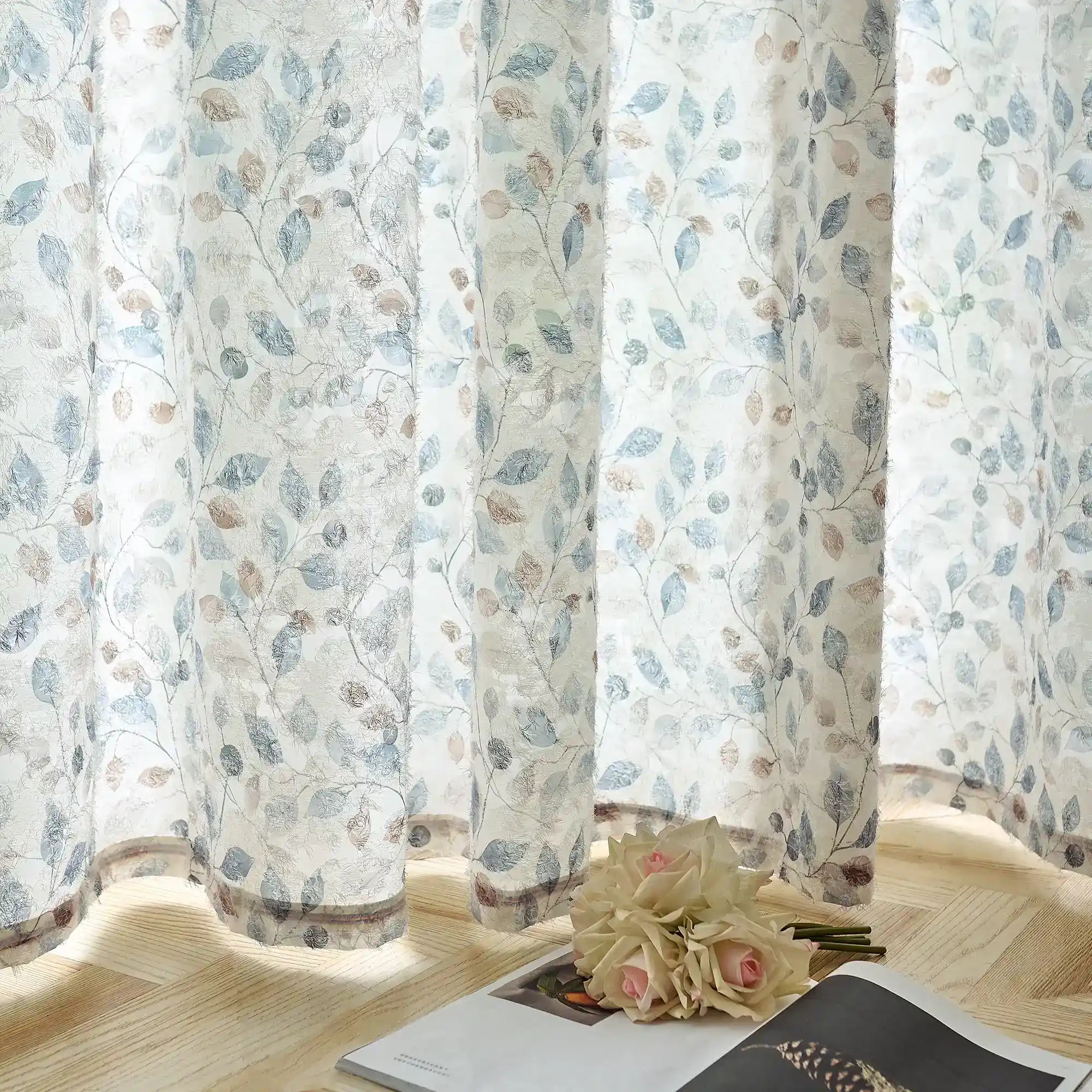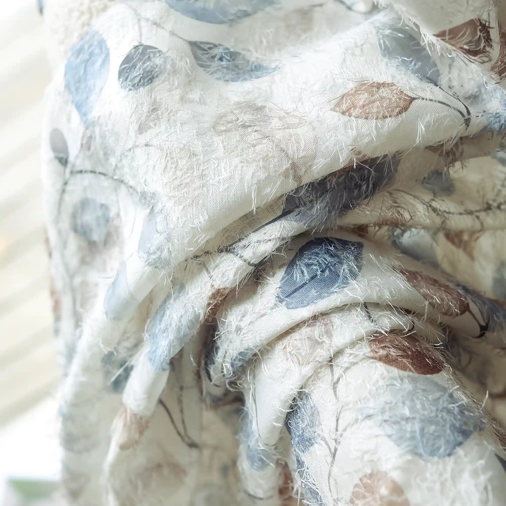 Ilyana Blue & Beige Leaf Patterned Print Sheer Curtains